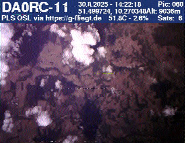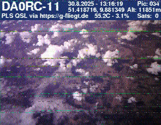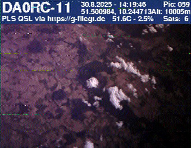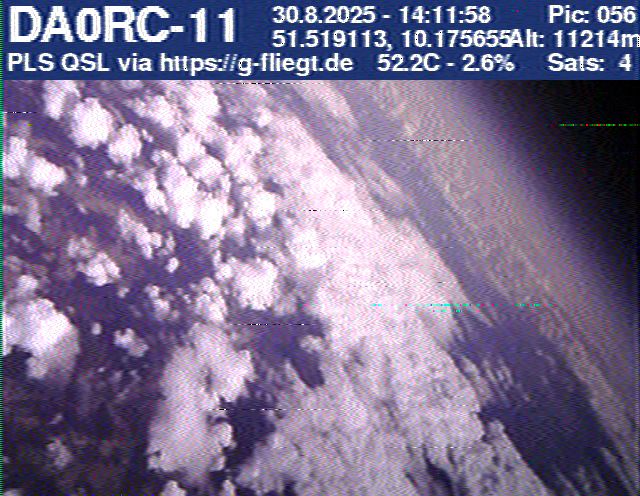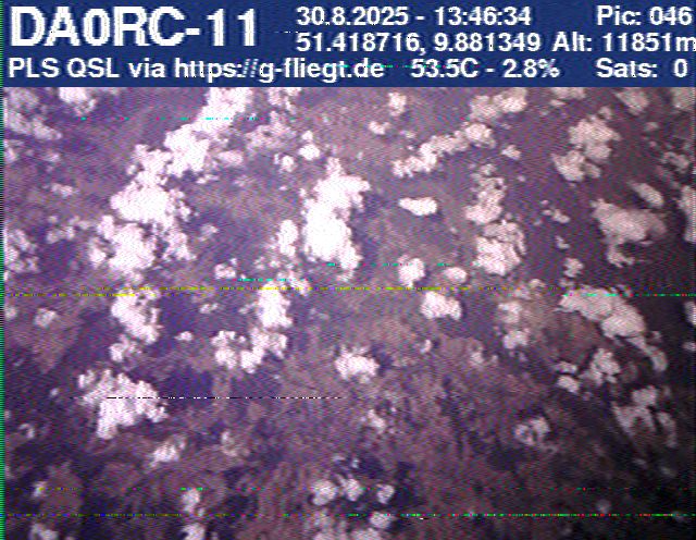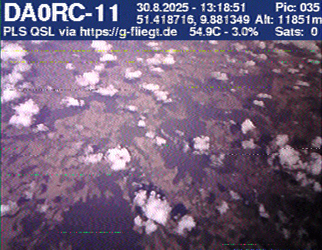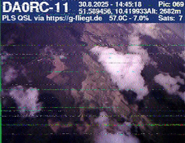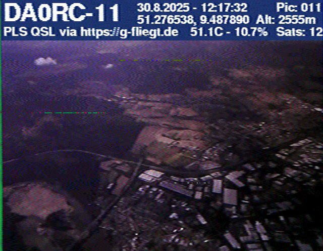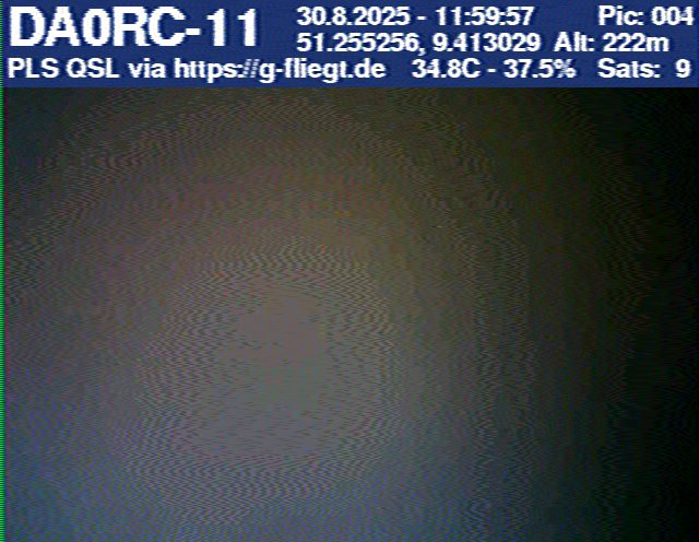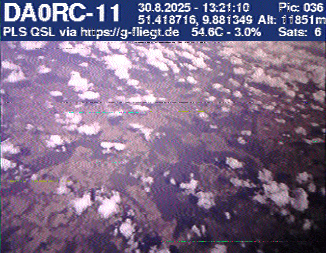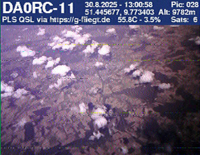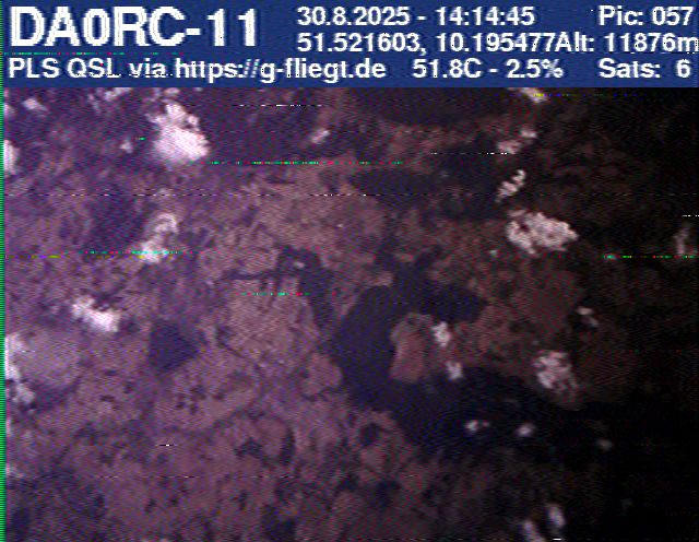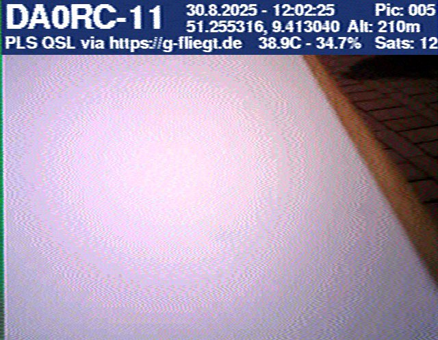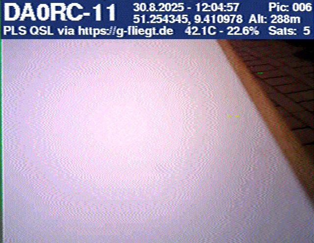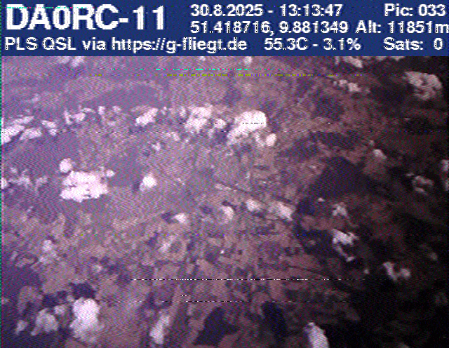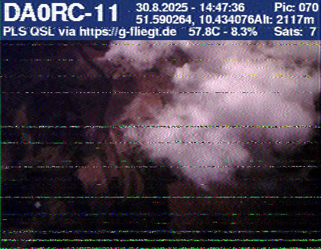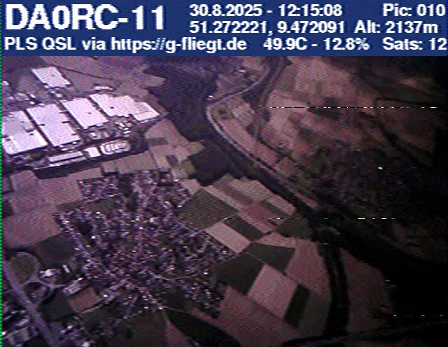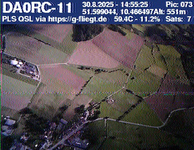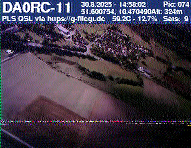 Zwischenzeitlich stellte das GPS-Modul des 2-m-Senders seinen Dienst ein. Sobald der Ballon nach dem Platzen jedoch wieder unter 12 km Höhe sank, erhielten wir erneut Positionsdaten per APRS. Damit konnte die Verfolgung fortgeführt werden. Nachdem Manuel die letzten fünf Bilder des Senders am berechneten Landeort empfangen hatte, begann die lokale Suche. Auf Bild 75 war zur Erleichterung des Jägers erkennbar, dass der Payload auf einem nur niedrig bewachsenen Feld liegen musste. Dank der genauen Standortübertragung per GPS und APRS konnte der Payload kurze Zeit später, nur etwa 1 km vom Empfangspunkt des letzten Bildes entfernt, geborgen werden.